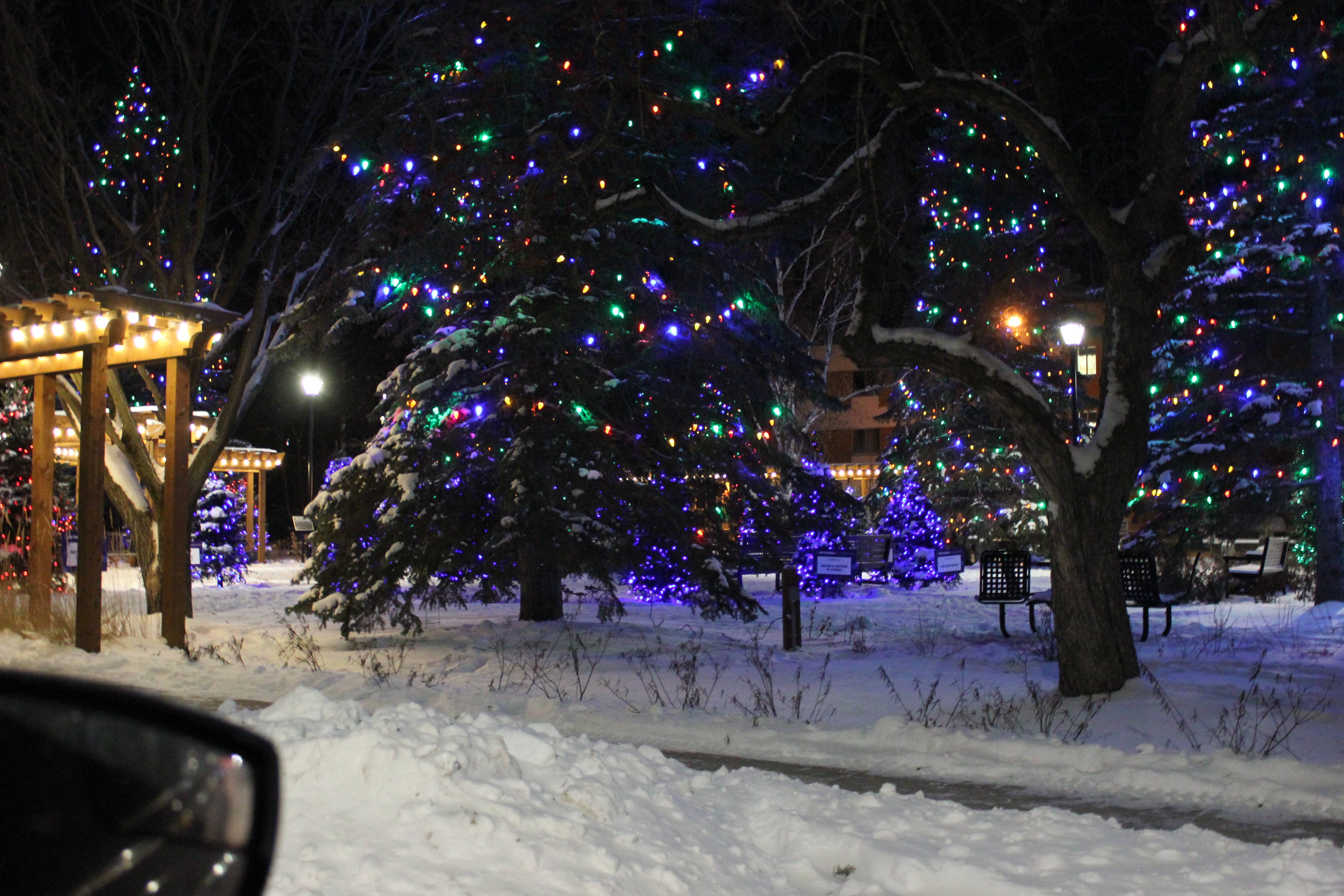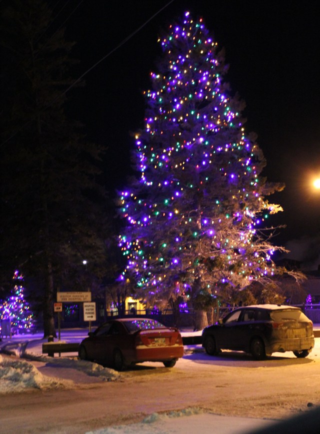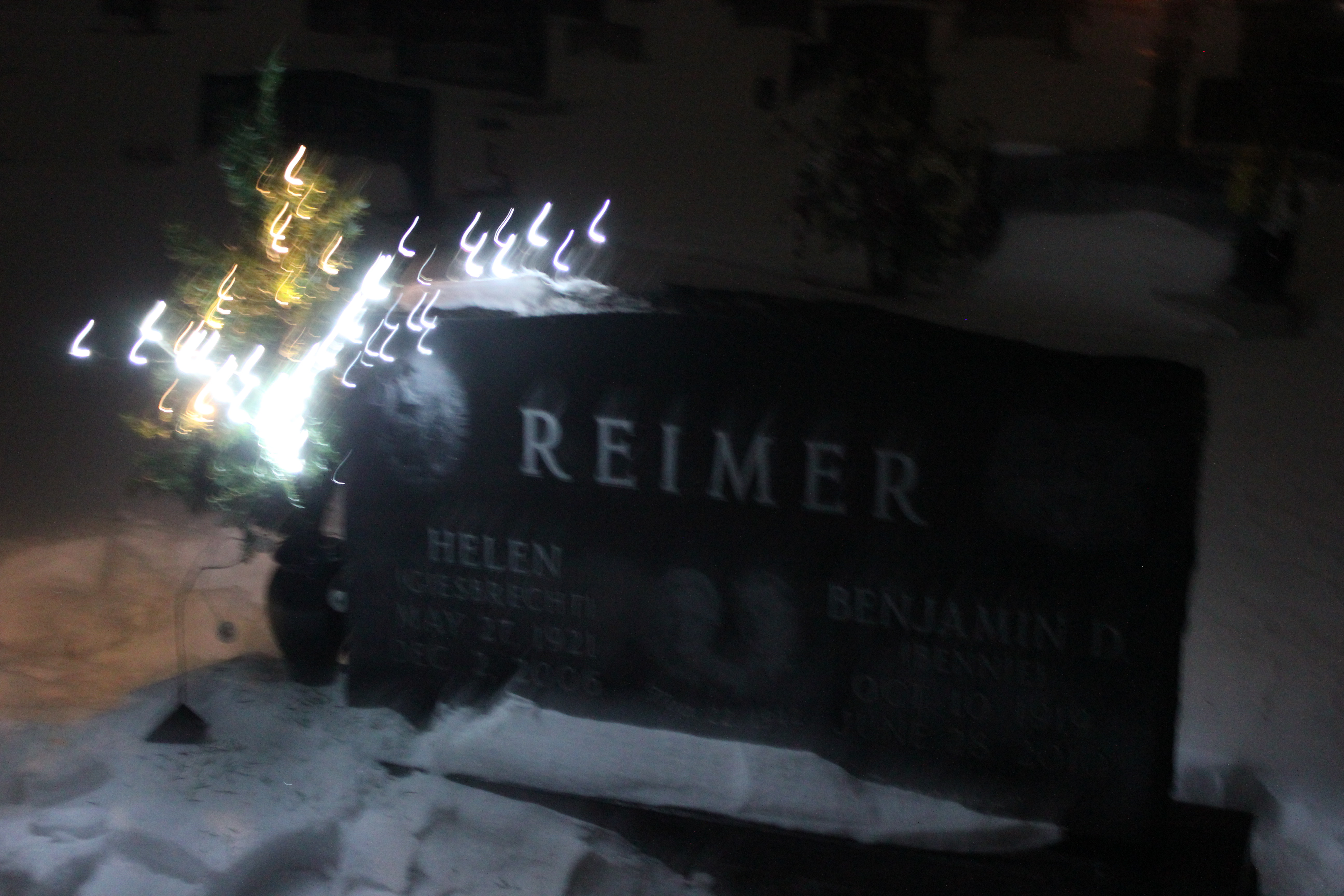 Peter and I put up a small Christmas tree with lights at my parents’ headstone on Christmas Eve.  I took several pictures that did not turn out that well.  I will post one of them so you get an idea of what I am talking about.  Private individuals and businesses decorate trees around the hospital each Christmas.  The result is really quite beautiful.  I took several pictures on Christmas Eve.