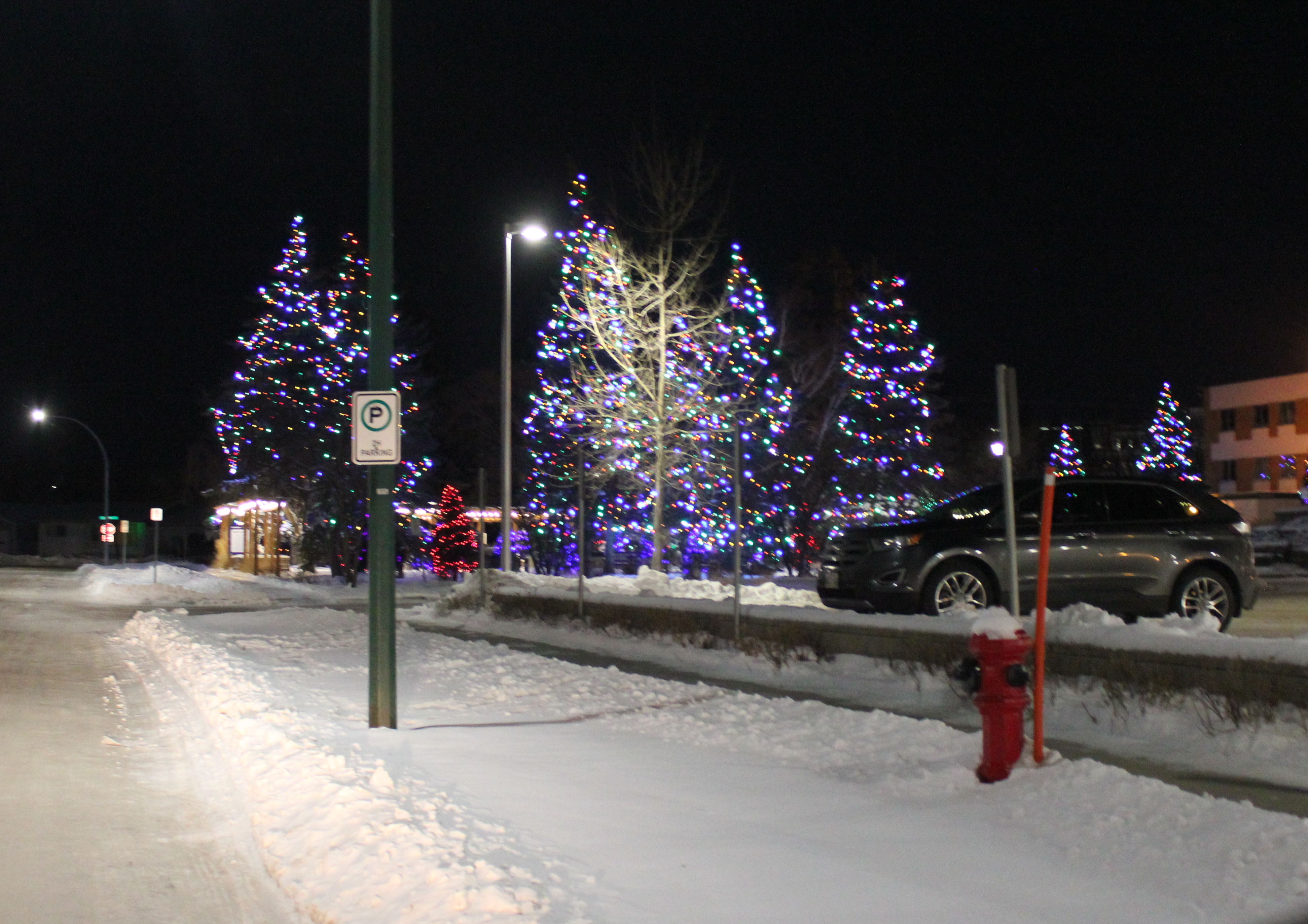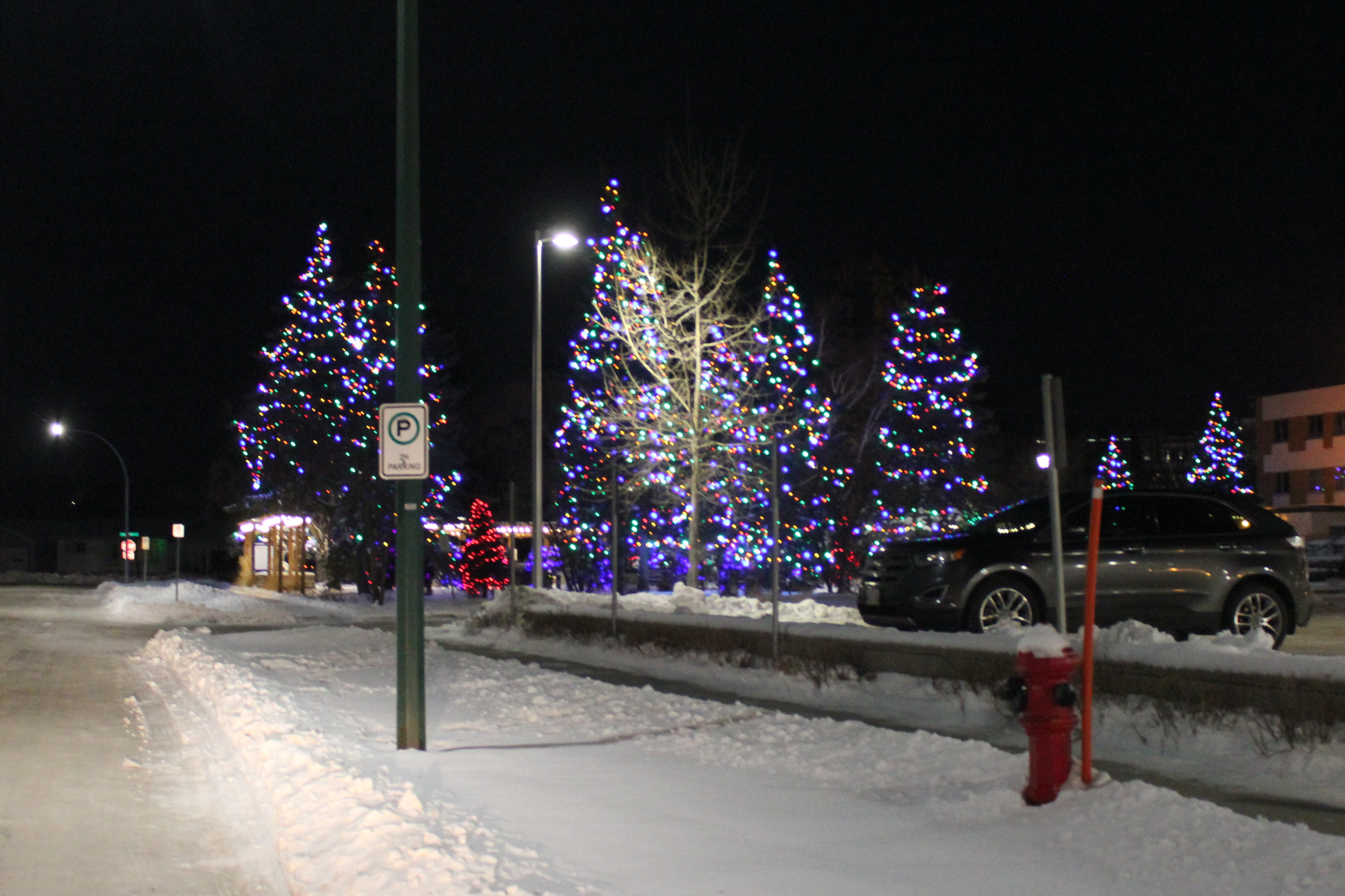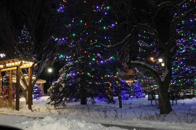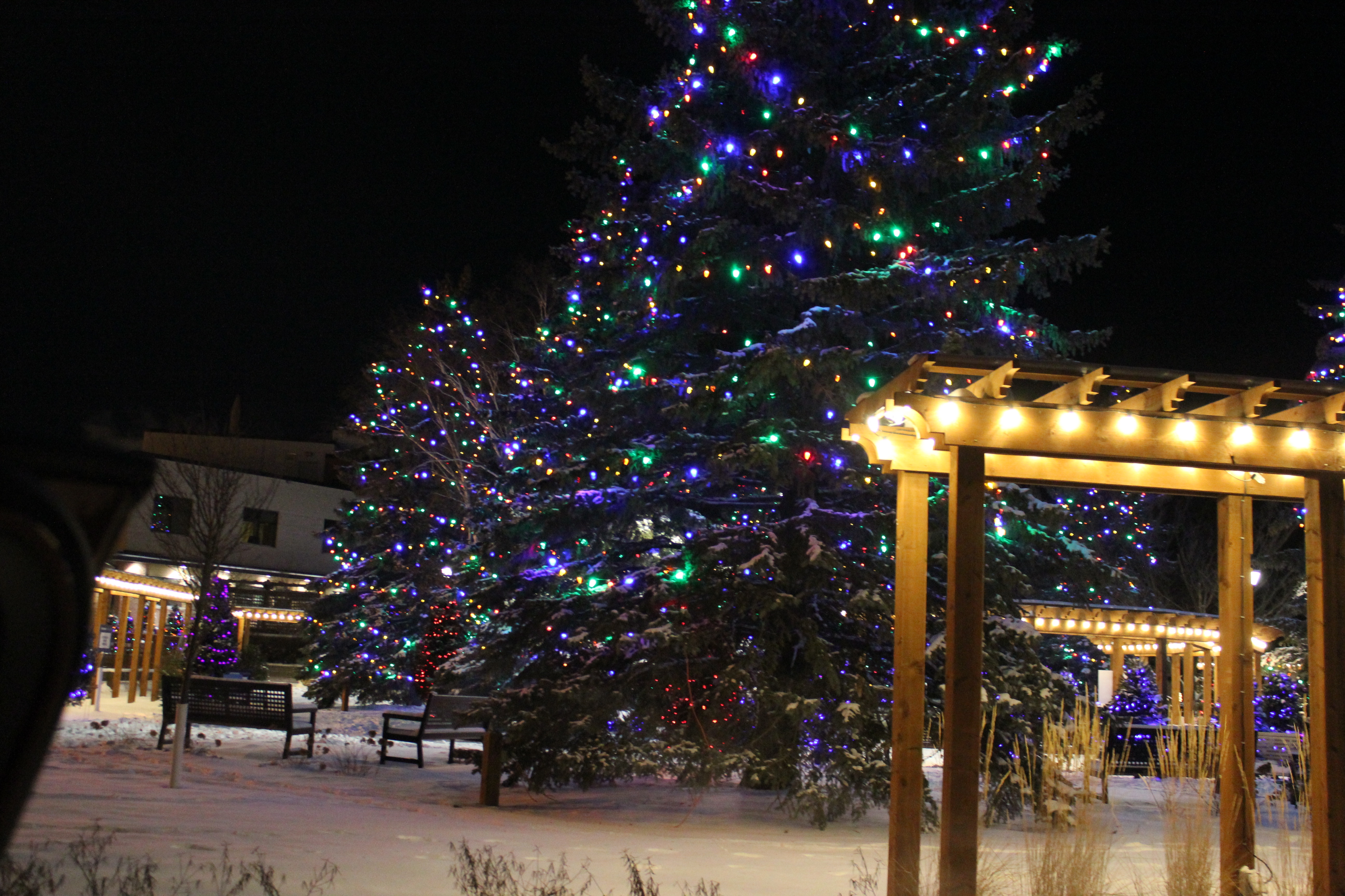 Peter and I put up a small Christmas tree with lights at my parents’ headstone on Christmas Eve.  I took several pictures that did not turn out that well.  I will post one of them so you get an idea of what I am talking about.  Private individuals and businesses decorate trees around the hospital each Christmas.  The result is really quite beautiful.  I took several pictures on Christmas Eve.