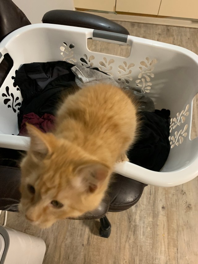 A tiny little kitten joined our family two weeks ago.  I call BoBo my great-grandson since he belongs to my grandson.  He is an adorable little creature with limitless energy.  Our two dogs are in the process of getting used to what they seem to consider an interloper.   Patches, the bigger of our two Shih Tzus has decided to hide whenever BoBo is around.  BoBo thinks Patches has an amazing feather growing out of his butt and loves to sneak up and try to play with it.  To be honest, Patches is slightly afraid of the little creature who loves to follow him around.